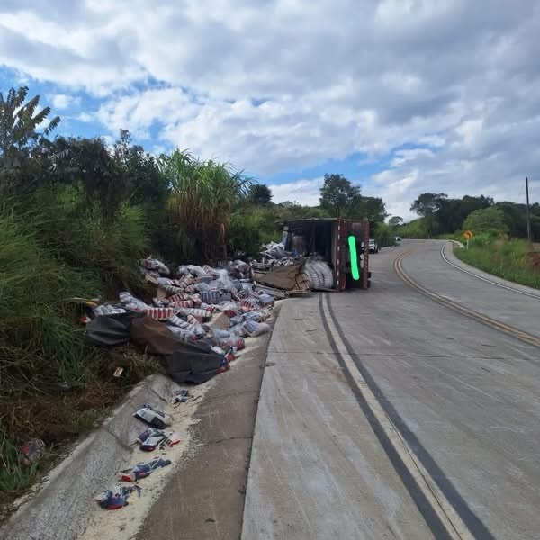 O veículo, com placas de Caibi, tracionava um semi-reboque carregado com arroz. Com o tombamento, a carga foi projetada para fora e ficou espalhada às margens da rodovia.